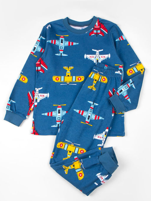 Пижама для мальчика из двух предметов. Кофточка свободного кроя не стесняет движений. Брюки с эластичным поясом и манжетами по низу. Ткань - интерлок, мягкая позволяет коже дышать и сохраняет тепло.