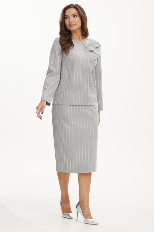 Элегантный комплект, состоящий из блузы и юбки, выполненных из мягкой костюмной ткани серого цвета в тонкую полоску. Блуза полуприлегающего силуэта с втачным рукавом. По спинке застежка на молнию. Блуза дополнена декоративным несъёмным украшением, выполненным из основной ткани. Юбка классического кроя на подкладке. По спинке застежка на потайную молнию.  Длина блузы от плечевого шва 65 см. Длина рукава 55 см. Длина юбки 70 см.­