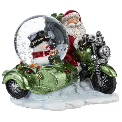 Мотоцикл с коляской, за рулем которого сидит довольный Дед Мороз с полным мешком подарков, а в коляске либо мишка, либо снеговик, находящиеся в стеклянном шаре. Высота фигурки с шаром 8 см. Все детали проработаны с высокой точностью, что придает изделию особый шарм и качество. Если потряти шар, то внутри закружатся белые хлопья снега, создавая праздничное настроение.