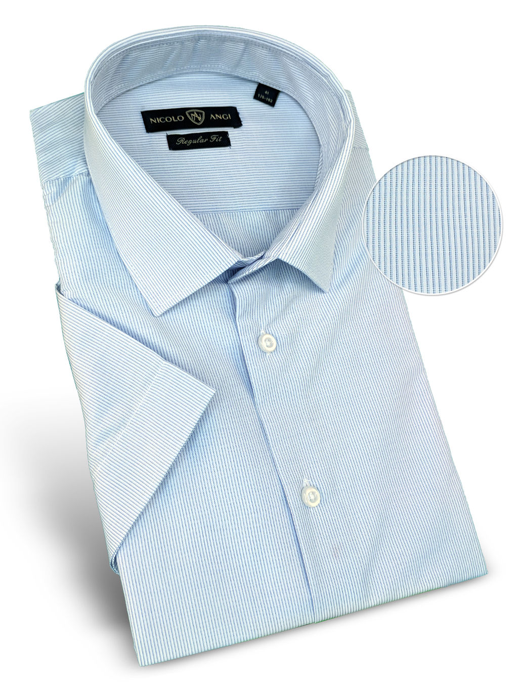Бренд: Nicolo Angi Длина рукава рубашки: Короткий Карман: Без кармана Силуэт: Полуприталенный силуэт (regular fit) Состав: 80% хлопок, 20% полиэстер Стиль: Деловой Узор (рисунок): В полоску Цвет: Голубой