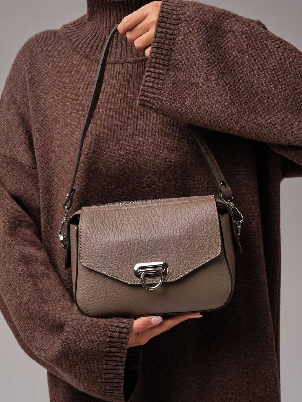 Кожаная женская сумка Azaro 3684 тауп соло - стильная и современная модель, выполненная из плотной, фактурной натуральной кожи с выразительным зернением. Материал выглядит дорого, отлично держит форму и устойчив к носке. Форма сумки лаконичная и аккуратная, что делает её универсальной для любых образов - от повседневного до более элегантного. Коричневый цвет всегда актуален: он подчеркивает фактуру кожи и легко сочетается с любой одеждой. Металлическая фурнитура в холодном серебристом оттенке придает модели современный характер. Стильная застежка одновременно выполняет декоративную и функциональную роль. Женская сумка Azaro 3684 тауп соло продается в комплекте с 2 ремнями - удобным коротким для ношения в руке или на плече, а также длинным, который позволяет носить ее через плечо как кросс-боди. Это делает модель практичной и адаптируемой под разные ситуации. Это стильная, продуманная и универсальная сумка, которая станет стильным акцентом и легко завершит любой образ. -- Характеристики -- Тип товара: Женские сумки Цвет: тауп соло Материал: Натуральная кожа Бренд: Azaro Тип: Сумка на плечо, Сумка через плечо Страна-изготовитель: Россия Высота, см: 18 Ширина, см: 22 Глубина, см: 9 Материал подкладки: Хлопок Количество внутренних отделений: 1 Количество внешних карманов, шт: 2 Тип застежки: Магниты, Зажим Формат А4: не вмещает Высота ручек, см: 23 Длина плечевого ремня, см: 116 Вес товара, г: 570 Ручки: На плечо, На локоть, Плечевой ремень Пол: женская коллекция Группа товара: Сумки Выгружать товары на сайт: Да