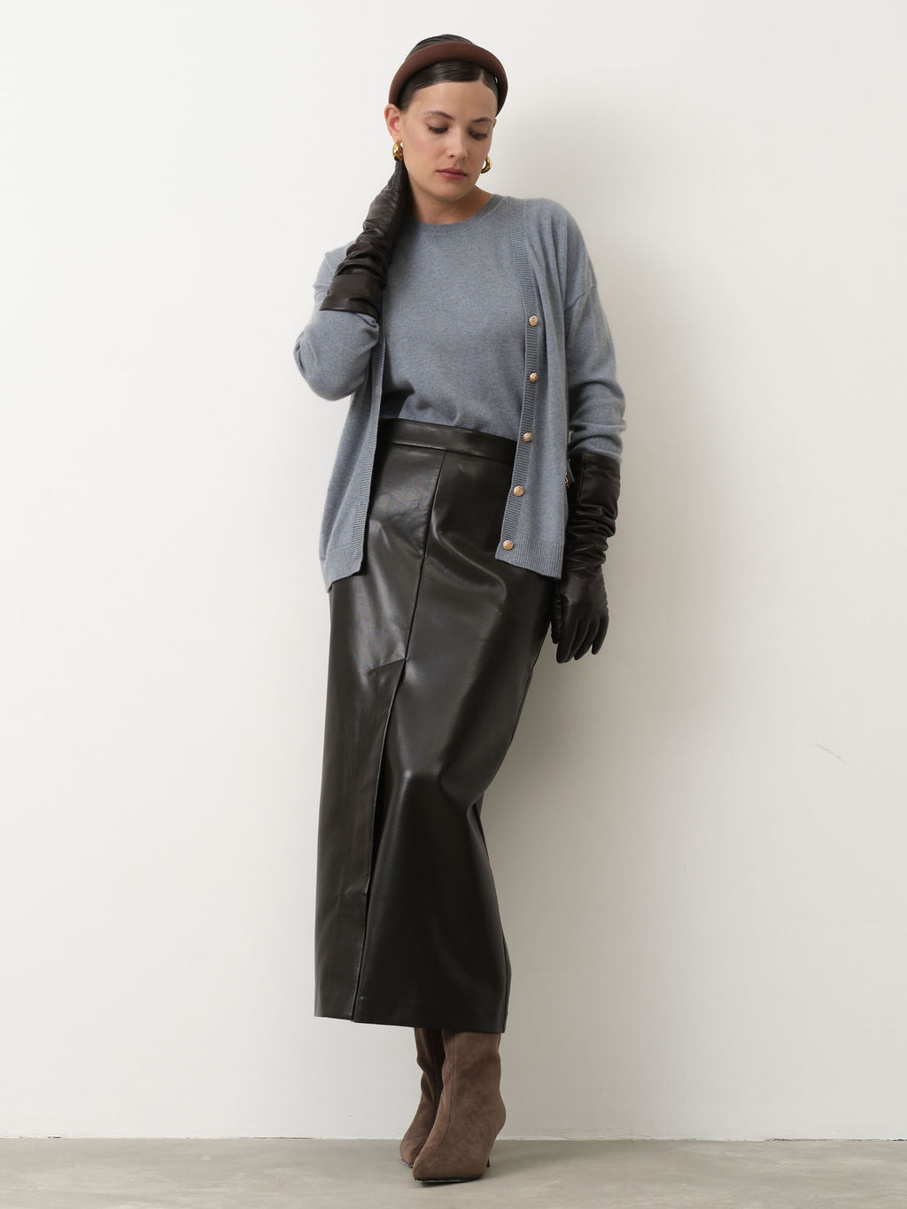 Элегантный кашемировый кардиган в благородном серо-голубом оттенке сочетает комфорт и изысканность. Модель имеет V-образный вырез и застёжку на ряд контрастных пуговиц с мягким блеском, создавая утончённый акцент. Два небольших накладных кармана украшены изящной золотистой цепочкой, добавляющей нотку шика. Прямой крой и мягкая текстура кашемира обеспечивают идеальную посадку и уют, а универсальный цвет легко комбинируется с брюками, юбками или платьями, создавая как повседневные, так и более нарядные образы.­
