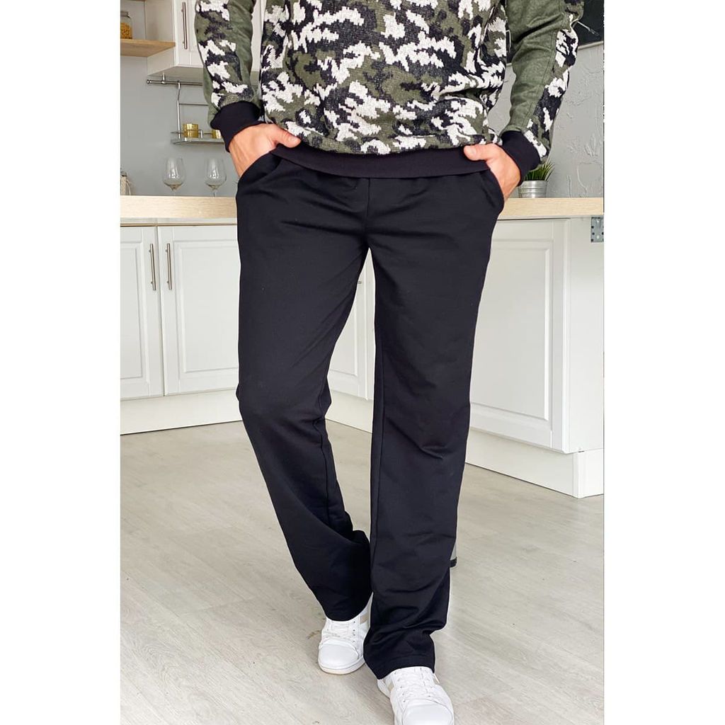 Брюки мужские, полуприлегающие. На передних половинках брюк внутренние карманы. Пояс выполнен на многоигольной машине. Ткань футер двухнитка - эластичная, мягкая, гигроскопичная, легкая в уходе и комфортная при носке.
