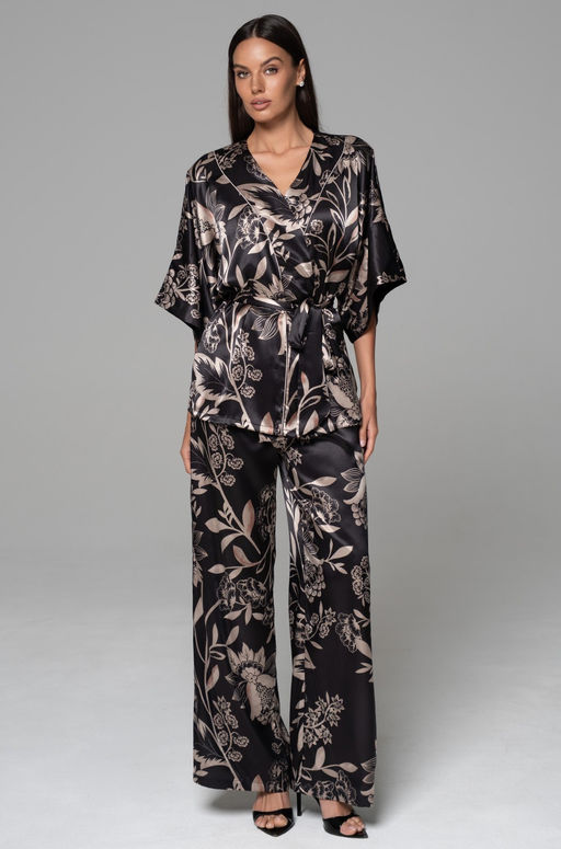 Комплект-тройка Mia-Amore состоит из запашного жакета, широких брюк и топа. Брюки и жакет выполнены из принтованного смесового шелка, а топ - из однотонного. Линия талии подчеркнута за счет широкого пояса, который идет в комплекте. Состав:70% натуральный шелк, 25% полиэстер, 5% эластан