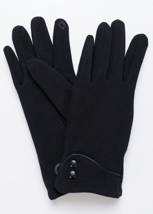 Женские перчатки из трикотажного полотна имитирующего внутри искусственный мех, декорированы кожанной окантовкой и пуговицами, на большом и указательном пальцах вышивка "сенсорными" нитками, размер 18. Состав: