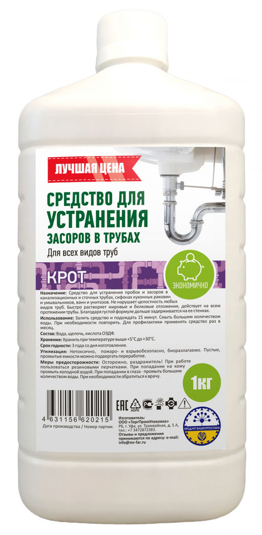 Средство для устранения засоров в трубах1л подходит для прочистки теплочувствительных пластиковых труб.