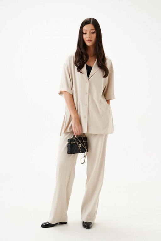 Блузка прямого свободного кроя выполнена из текстильной ткани. Характеристики: отложной воротник, застежка центральная на петли пуговицы, спущенная линия плеча, по бокам изделия разрезы 31см, рукав кароткий прямого кроя. Длина рубашки 75 см, длина рукава от края горловины 44см.