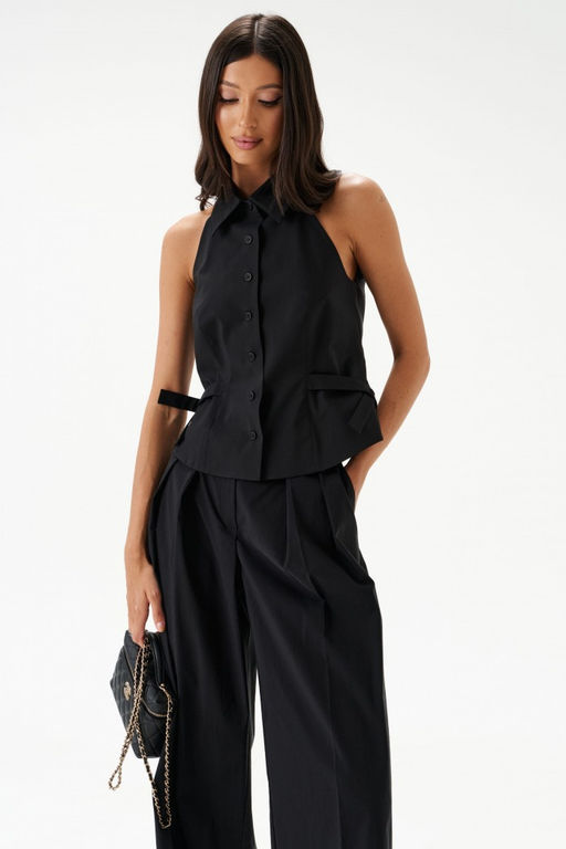 Жилет с открытыми плечами прилегающего силуэта выполнен из текстильного полотна черного цвета. Характеристики: прилегающий силуэт, подкладка, застежка центральная на петли пуговички, отложной воротник, по бокам изделия декоративные детали. Длина по спинке 49 см.