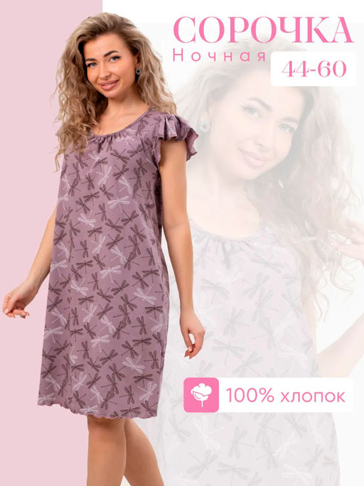Перед Вами милая и нежная женская сорочка для комфортного сна. Лёгкая ночнушка свободного кроя прекрасно сидит на фигуре любого типа. Изготовлена из 100% натурального хлопка, ткань мягкая, дышащая и приятная к телу, прекрасно тянется. В то же время ткань достаточно плотная, не просвечивает. Очень мило смотрятся нежные веточки лаванды, мелкие изящные цветочки, кружевные сердечки на светлом фоне. Рукав –крылышко со сборками дает полную свободу движений. Отделка рукава и низа изделия (обметочная строчка с вытяжкой ткани) смотрится легко, воздушно. Небольшое изящное украшение из атласной ленточки на овальном вырезе горловины завершает нежный образ. Длина изделия – чуть ниже колена. Рост сорочки универсальный. Силуэт сорочки расклешенный, она прекрасно подойдёт также будущим мамам. Размерный ряд 44-60. Эта сорочка - волшебный подарок для ваших родных и знакомых! Длина ночной сорочки 98-102 см в зависимости от размера. Параметры модели на фото: 90-65-98. Рост 165 см. На модели 44 размер. -- Характеристики -- Вес: 220 кг Ткань: Трикотаж Состав: 100 % хлопок Отделка: Без отделки Режим стирки: При 40 градусах Целевая аудитория: Взрослая Розничная цена: 810