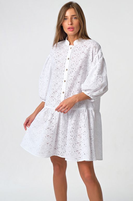 Особенности: Платье свободного силуэта из хлопковой ткани с шитьем. Детали: воротник-стойка, притачная планка по переду с застежкой на петли-пуговицы, спущенная линия плеча, широкий рукав со сборкой по окату и по низу, по низу платья широкая оборка.