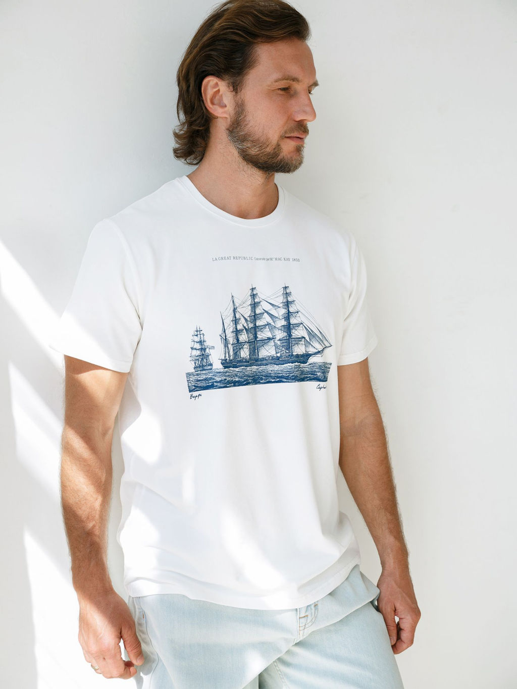 Старинные морские гравюры, шум парусного фрегата и запах старых карт все это вдохновило на создание футболки. На груди Great Republic, один из самых больших деревянных кораблей своего времени, символ силы и красоты мореплавания.