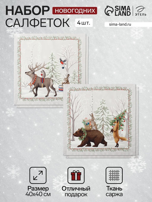 Серые салфетки с новогодними животными для создания праздничной атмосферы! Набор из четырёх текстильных аксессуаров с тематическим принтом поможет оформить стол для зимнего торжества. Плотная хлопковая основа с саржевым переплетением обеспечивает защиту поверхности и сохраняет внешний вид после многократного использования.Современный дизайн: Нейтральный серый фон с изображением животных создаёт атмосферу зимнего праздника — салфетки органично дополнят как скандинавский, так и классический стиль сервировки.Защитные свойства: Плотность 190 г/м² обеспечивает барьер между посудой и столешницей — ткань устойчива к контакту с нагретыми предметами и случайным проливам.Универсальное применение: Квадрат 40×40 см подходит для сервировки основных блюд, оформления десертной зоны или использования в качестве декоративных элементов.Долговечность ухода: Щадящие режимы обработки — стирка при 40°C без отбеливания и глажка при 110°C — сохраняют цвет и структуру материала.Почему этот набор выбирают для праздничного стола? Он сочетает эстетику с практичностью — нейтральный серый цвет служит универсальным фоном для различной посуды, а изображения животных добавляют праздничный акцент. Качественный хлопок обеспечивает функциональность повседневного использования. Идеальное решение для тех, кто ценит современную элегантность и лаконичность в деталях сервировки! Набор: Да. Форма: Квадратная. Ткань: Саржа. Плотность, г/м²: 190. Размер, см: 40 х 40. В наборе, шт.: 4. Тематика: Новогодняя. Тематика: Животный мир. Тематика: Рождественская. Вид упаковки: Пакет с крючком. Рисунок: Да. Символ года: Нет. Тематика праздника: Рождество. Тематика праздника: Новый год. Декоративные элементы: Без элементов. Рекомендации по уходу: Не отбеливать. Рекомендации по уходу: Глажка при 110 °С. Рекомендации по уходу: Стирка при 40 °С. Назначение полотенец: Салфетки. Влаго-грязе-масло отталкивающая пропитка: Нет. Особенности: Без особенностей. Фактурные: Нет. Бесплатная доставка: Да. Наша разработка: Да.