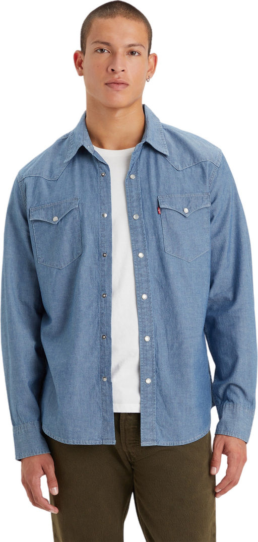 Классическая джинсовая рубашка Levis в стиле вестерн. Выполнена из 100% хлопка. Прямой крой. Длинные рукава с кнопками на манжетах. Фигурная кокетка. Изогнутый подол рубашки. Два нагрудных кармана с клапанами на кнопках. Сочетайте рубашку с любимыми джинсами, носите с футболкой как пиджак - на Диком Западе нет никаких правил.