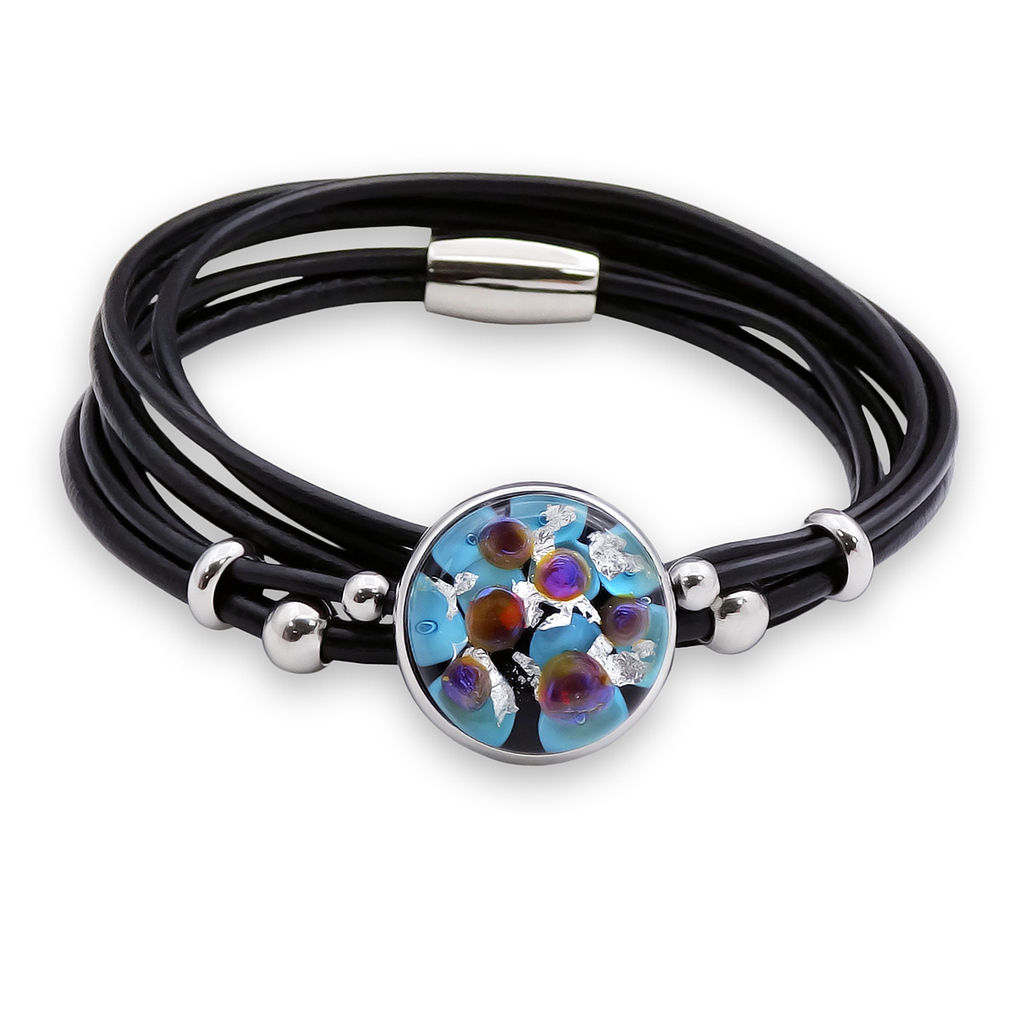 Браслет изготовлен из муранского стекла, натуральной кожи и гипоаллергенной ювелирной стали, что очень важно для людей с чувствительной кожей. Металл не темнеет и не подвергается воздействиям окружающей среды, надолго обеспечивая красивый внешний вид изделия. Крепкий магнитный замок надежно фиксируется на запястье. Ширина браслета - 1 см. Диаметр стеклянного элемента - 2 см. Вес - 18 гр.