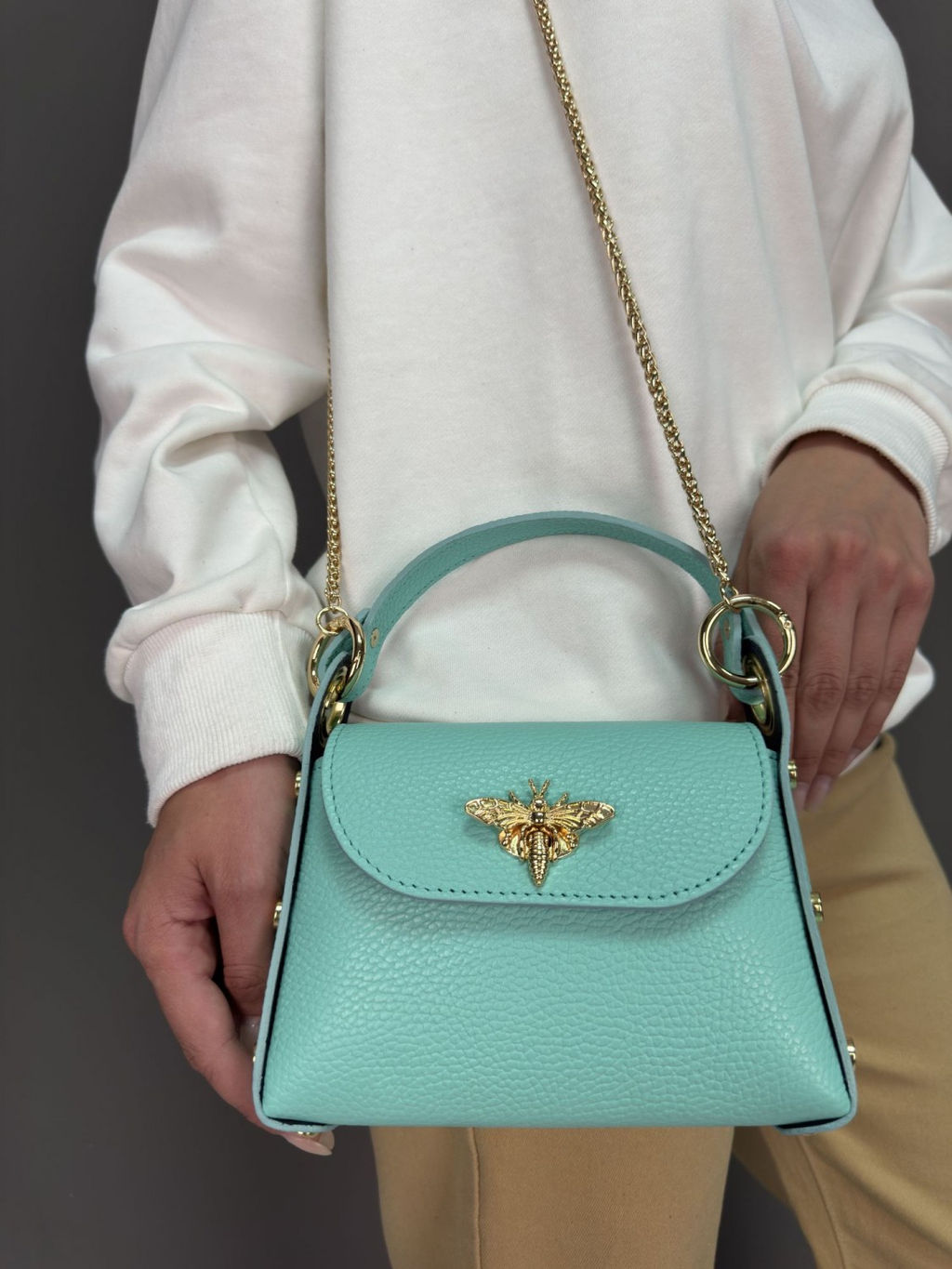 Страна: Италия Акции: Товары со скидкой Производитель: Pelletteria Luisa, Italy Размер: маленькая Стиль ношения: на ремешке через плечо Форма: жесткая Выделка кожи: зернистая износостойкая Цвет кожи: Бирюзовый Оттенок: ярко-бирюзовый Палитра цветов: TB-101028 Размеры: длина: 18 см \tвысота: 12 см \tширина: 6 см \tвысота ручки: 9 см \t Описание: Красивая аккуратная необыкновенно модная женская сумка из натуральной кожи. Тренд 2024 года, Базовая коллекция Sefaro, Италия. Главные особенности модели: кросс-боди, замок в виде золотой бабочки, съемный плечевой ремень-цепочка, а также заклепки на боковых стенках сумки используется фурнитура высокого итальянского качества в золотом цвете. Все эти элементы непременно привлекут к вам внимание окружающих своей яркостью и оригинальностью исполнения. Сумочка имеет каркасную форму, компактная, выполнена из зернистой телячьей кожи надежной и прочной в носке, может использоваться как повседневная модель, но подойдет и для торжественного случая элегантно дополнит вечерний образ по типу клатча, либо подчеркнет сдержанный деловой, классический или даже винтажный стиль. Закрывается сумка внахлест на элегантную застежку с пряжкой, внутри один отдел, в котором поместится только самое необходимое. На дне сумки металлические защитные ножки. Можно носить в руке, на запястье, либо на изящной цепочке через плечо (длина 120см) - очень удобно!