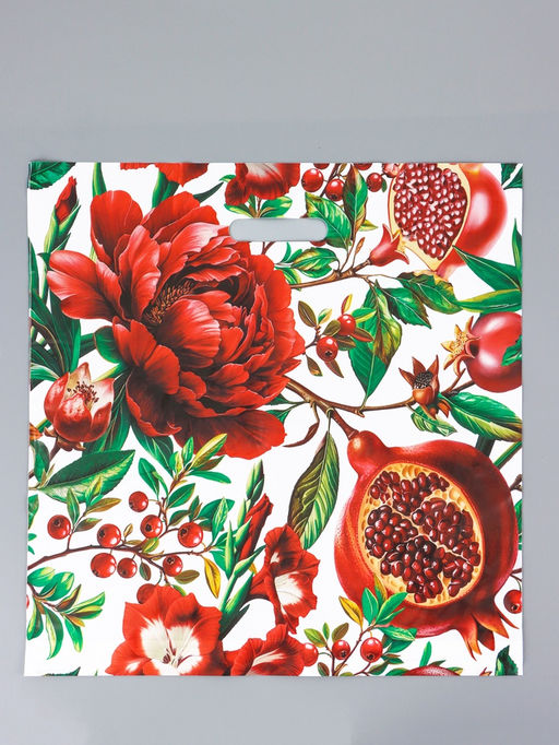 Экзотичный и сочный акцент. Пакет Цветок Граната это вместительная квадратная сумка с необычным ботаническим рисунком. Изображение яркого цветка и плода граната создаёт образ, сочетающий красоту, изобилие и лёгкую экзотику.