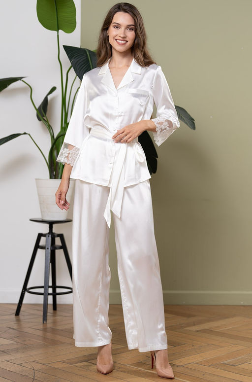 Комплект Mia-Amore состоит из жакета и широких брюк. Изделия комплекта выполнены из смесового однотонного шелка. Кружево на рукавах жакета инкрустировано кристаллами Swarovski. Линию талии можно подчеркнуть за счет пояса, который идет в комплекте. Состав:70% натуральный шелк, 25% полиэстер, 5% эластан