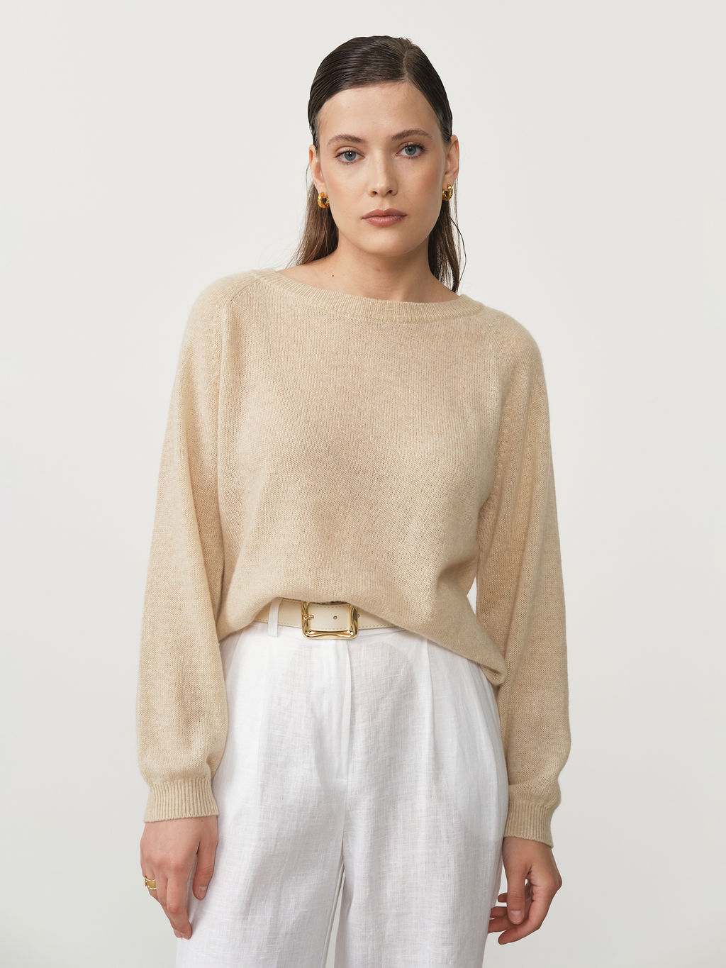 Классический крой с круглой горловиной обеспечивает идеальную посадку по фигуре, не стесняя движений. Безупречная, равномерная вязка создает эффект шелковистой гладкости и подчеркивает премиальный характер изделия. Бежевый оттенок воплощение тонкого вкуса и элегантности, легко интегрируется в любой гардероб и стилистические направления.