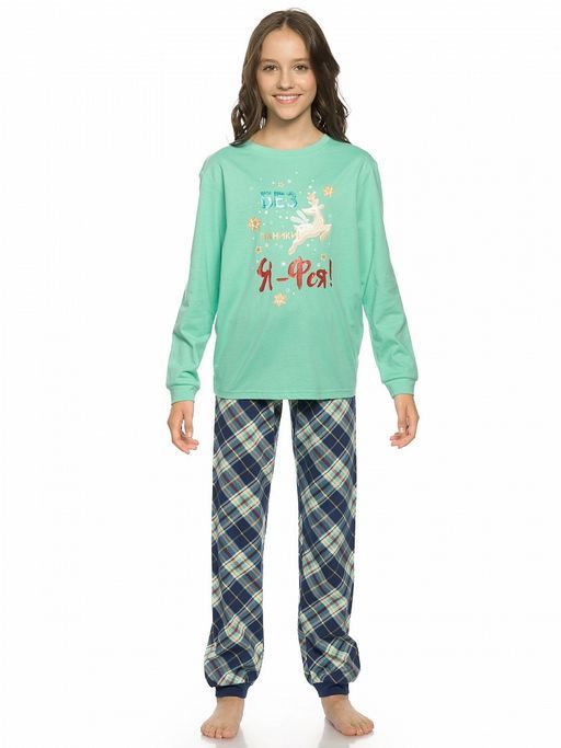 Комплект для девочек-лонгслив цвета Тиффани с принтом в виде пряничного оленя с золотом и разноцветным глиттером. Брюки комфортного объема в Allовер принт клетку. Декор-атласный бантик на поясе.