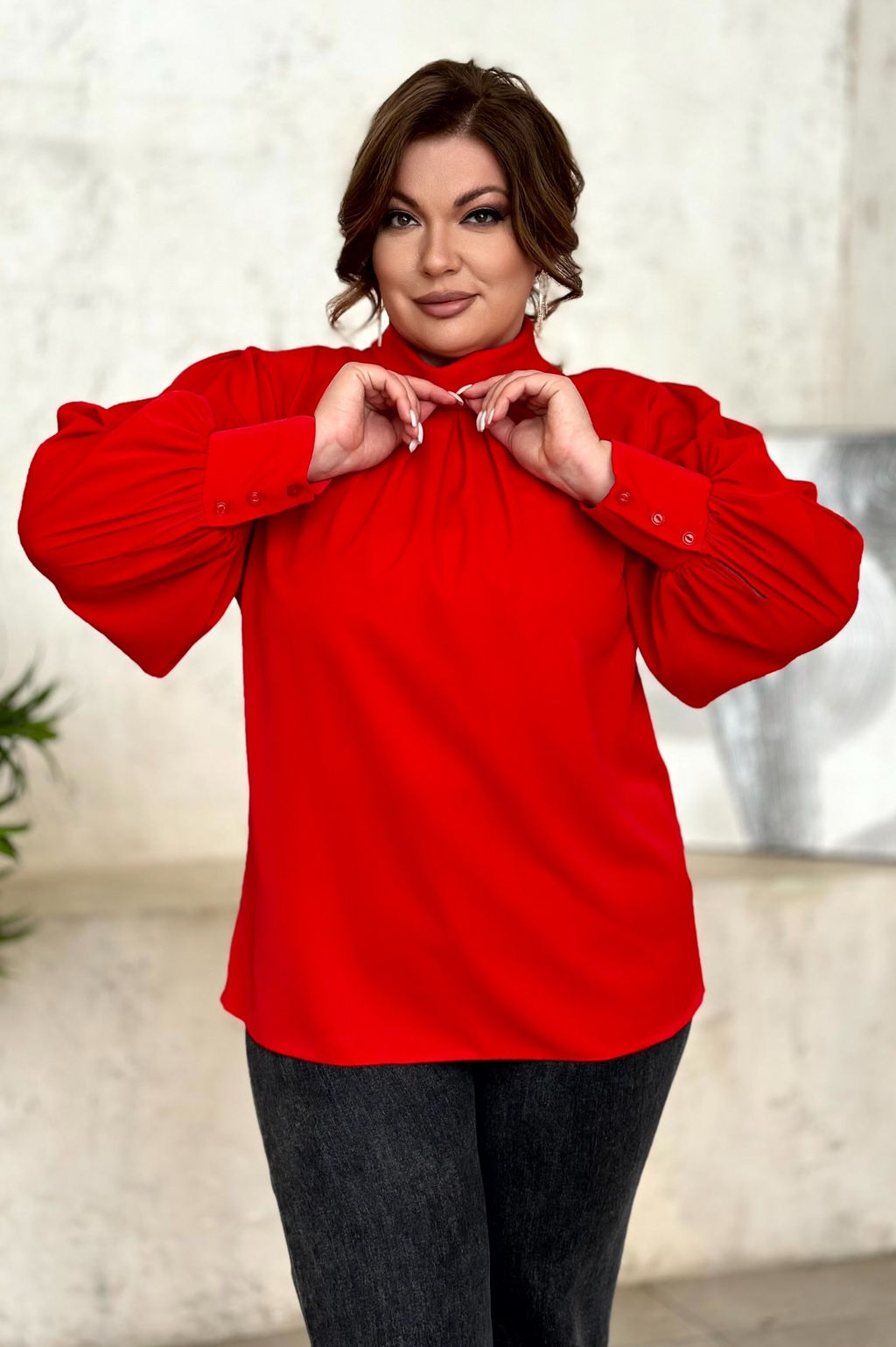 Блузка искусственный шелк "рукав фонарик" на манжетах со складками на груди красная