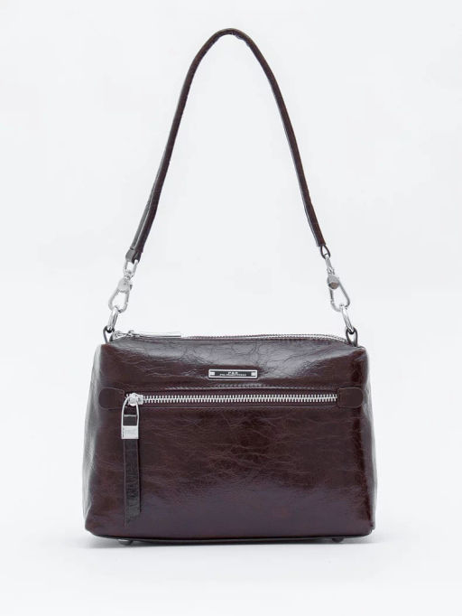 Модель кросс-боди, выполнена из натуральной кожи.  Дополнена серебристой фурнитурой. Данная модель закрывается на молнии. Каркас мягкий. Носится на плече за съемный ремень. Или в руке за за удлиненную съёмную ручку. На дне предусмотрены ножки.