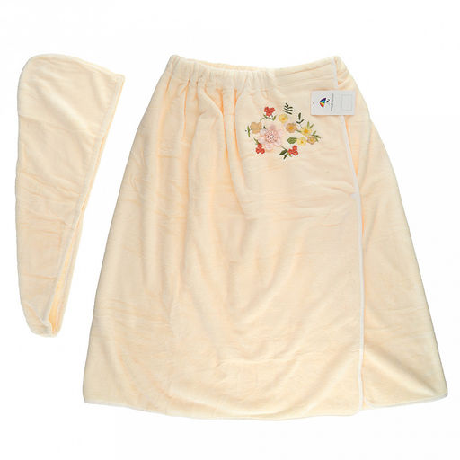 Парео махровое "Свежий букет" 70х175см, хлопок 100%, на резинке с липучкой, на кнопке, с вышивкой; с чалмой на пуговице 68х25см, ванильный (Китай)