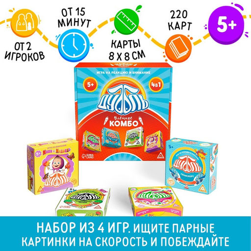 4 игры в одной коробке!Дамы и господа, приготовьтесь. Представляем вашему вниманию «Дуббль. Комбо»! Мы собрали 4 самые популярные игры и сложили всё в одну коробку. Теперь тренировать внимание и реакцию будет ещё интереснее!Какие игры есть в наборе?«Дуббль. Автоматизация Звуков», 55 карт;«Дуббль. Алфавит», 55 карт;«Дуббль. Маша и медведь», 55 карт;«Дуббль. Транспорт», 55 карт.Что с ними делать?Меняйте игровые колоды хоть каждый день, только придерживайтесь основных правил. На счёт «три» переворачивается карта на столе, и все участники ищут совпадения со своими карточками.Первый, кто отыщет подходящую картинку, выкрикивает её название, забирает верхнюю карту из колоды и кладёт её сверху на свою. Тем самым он открывает следующую карточку из основной колоды — и теперь совпадения нужно искать уже с другими картинками.Таким образом, карточки в основной колоде будут всё время меняться, поэтому игроки должны быть очень внимательными. А победит тот, кто быстрее избавится от всех карт!Смотрите, хватайте и побеждайте! Возраст: От 5 лет. Количество игроков: 2 - 4 игрока. Количество игроков: 6 и более. Количество игроков: 4 - 6 игроков. Жанр игры: Семейная. Жанр игры: На реакцию и внимание. Повод для игры: День Рождения. Повод для игры: Вечеринка. Повод для игры: Праздник. Развитие навыков: Память. Развитие навыков: Внимание. Развитие навыков: Реакция. Количество игроков: 2 - 6. Бесплатная доставка: Да. Наша разработка: Да. Размеры товара: 19/3/19.