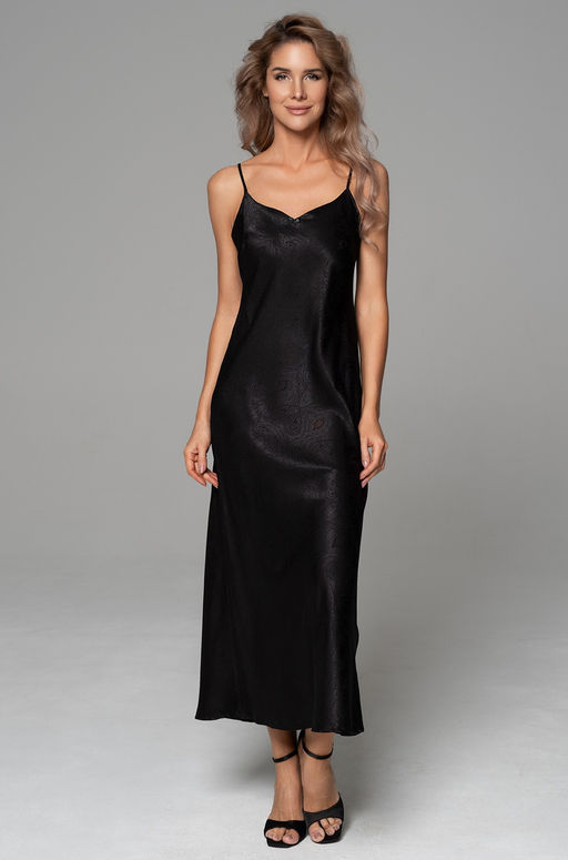 Элегантная длинная сорочка Mia-Amore на тонких бретелях без подреза под грудью с фигурным вырезом. Изделие выполнено из смесового шелкового жаккардового полотна. По низу боковых швов обработаны разрезы для свободы движения. Декор - атласный бантик с подвеской по центру выреза. Состав:70% натуральный шелк, 25% полиэстер, 5% эластан