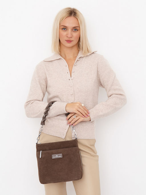 Функциональная сумка, выполнена из замши. Декорирована логотипом на передней части. Дополнена серебристой фурнитурой. Данная модель закрывается на молнию. Каркас полужесткий. Носится в руке за съемную ручку-цепочку или на плече. В комплекте имеется съемный ремень с регулировкой длины.