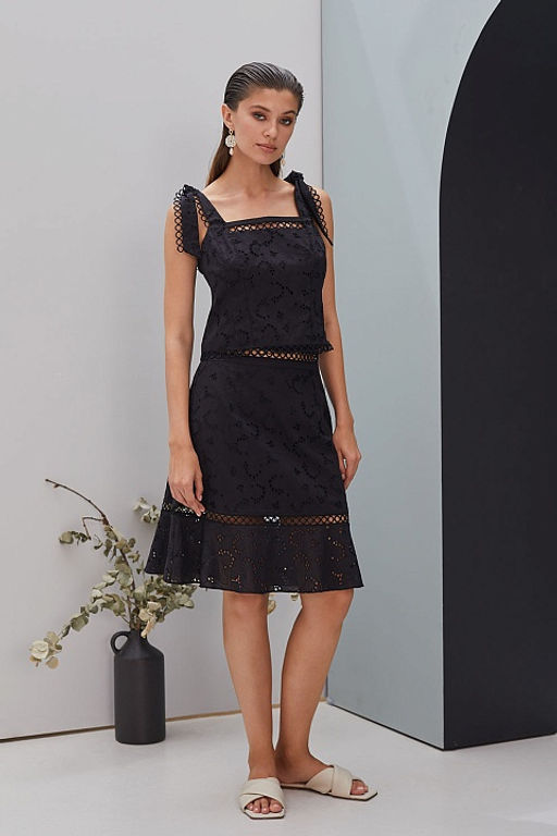 Черная юбка А-силуэта средней длины. Хлопковая ткань кроше с оригинальным флористическим рисунком в сочетании с дизайнерской тесьмой в виде колец создают неповторимый образ. Изделие отличается женственностью и утонченностью и подойдет, как для долгих летних прогулок, так и для вечерних свиданий.­