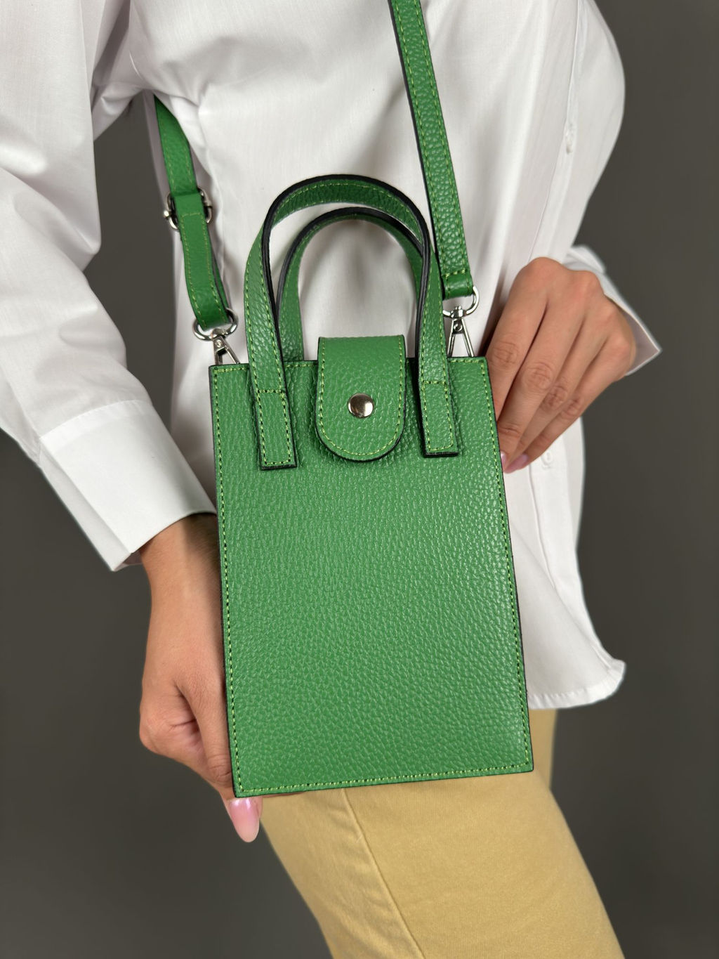Страна: Италия Акции: Товары со скидкой Производитель: Pelletteria Luisa, Italy Размер: маленькая Стиль ношения: на ремешке через плечо Форма: жесткая Выделка кожи: зернистая износостойкая Цвет кожи: Зеленый Оттенок: ярко-зеленый Палитра цветов: TB-305222 Размеры: длина: 19 см \tвысота: 13 см \tширина: 5 см \tвысота ручки: 9 см \t Описание: Лаконичная, нежная, необыкновенно модная женская сумка из натуральной кожи. Тренд 2024 года, Базовая коллекция Sefaro, Италия. Главные особенности модели: кросс-боди, замок в виде небольшого хлястика с кнопкой, съемный плечевой кожаный ремешок, а также аккуратная контрастная отсрочка элементов сумки. Используется фурнитура высокого итальянского качества в серебряном цвете. Все эти элементы непременно привлекут к вам внимание окружающих своей яркостью и изящностью исполнения. Сумочка имеет каркасную форму, компактная, выполнена из зернистой телячьей кожи надежной и прочной в носке, может использоваться как повседневная модель, но подойдет и для торжественного случая элегантно дополнит вечерний образ по типу клатча, либо подчеркнет сдержанный деловой, классический или даже винтажный стиль. Закрывается сумка внахлест хлястиком на кнопку, внутри одно отделение, в котором поместится только самое необходимое. В комплекте идет плечевой кожаный ремешок, который регулируется по длине максимально до 110см. Можно носить за ручки в руке, на тонком запястье, либо на ремешке через плечо очень удобно!