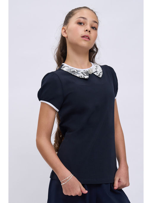 Блуза трикотажная для девочки с короткими втачными рукавами, присборенными по окату. Горловина полочки блузки оформлена плосколежащим воротником из основного полотна и гипюра с застежкой капелька по центру спинки. Низ рукавов и горловина окантованы трикотажной бейкой контрастного цвета. Состав:92% хлопок, 8% лайкра