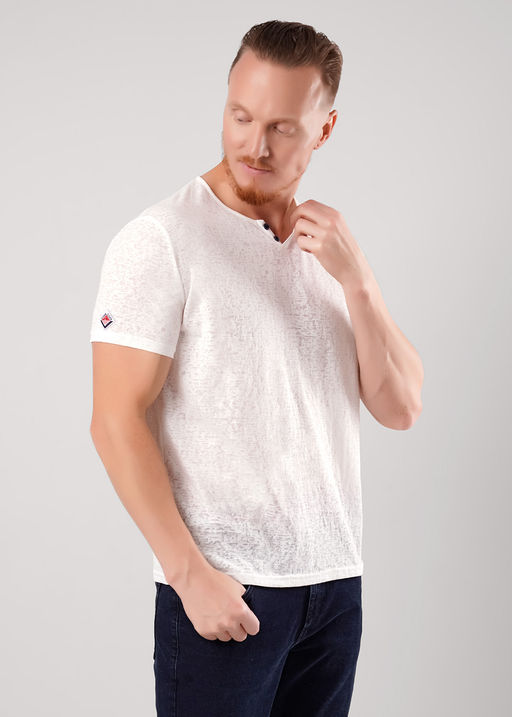 Футболка мужская с круглым вырезом горловины и декоративной планкой с пуговицами, с коротким втачным рукавом. Модель дополнена имиджевой фурнитурой, что делает образ стильным и завершенным. 51% полиэстер, 49% хлопок