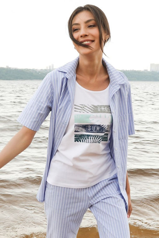 Жакет дополнит образ к брюкам и шортам данной коллекции. Идеален для летних прогулок. Декорирован накладным нагрудным карманом.