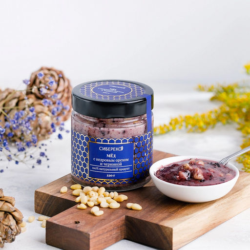 • Мёд с ядром кедрового ореха и черникой 220 г
