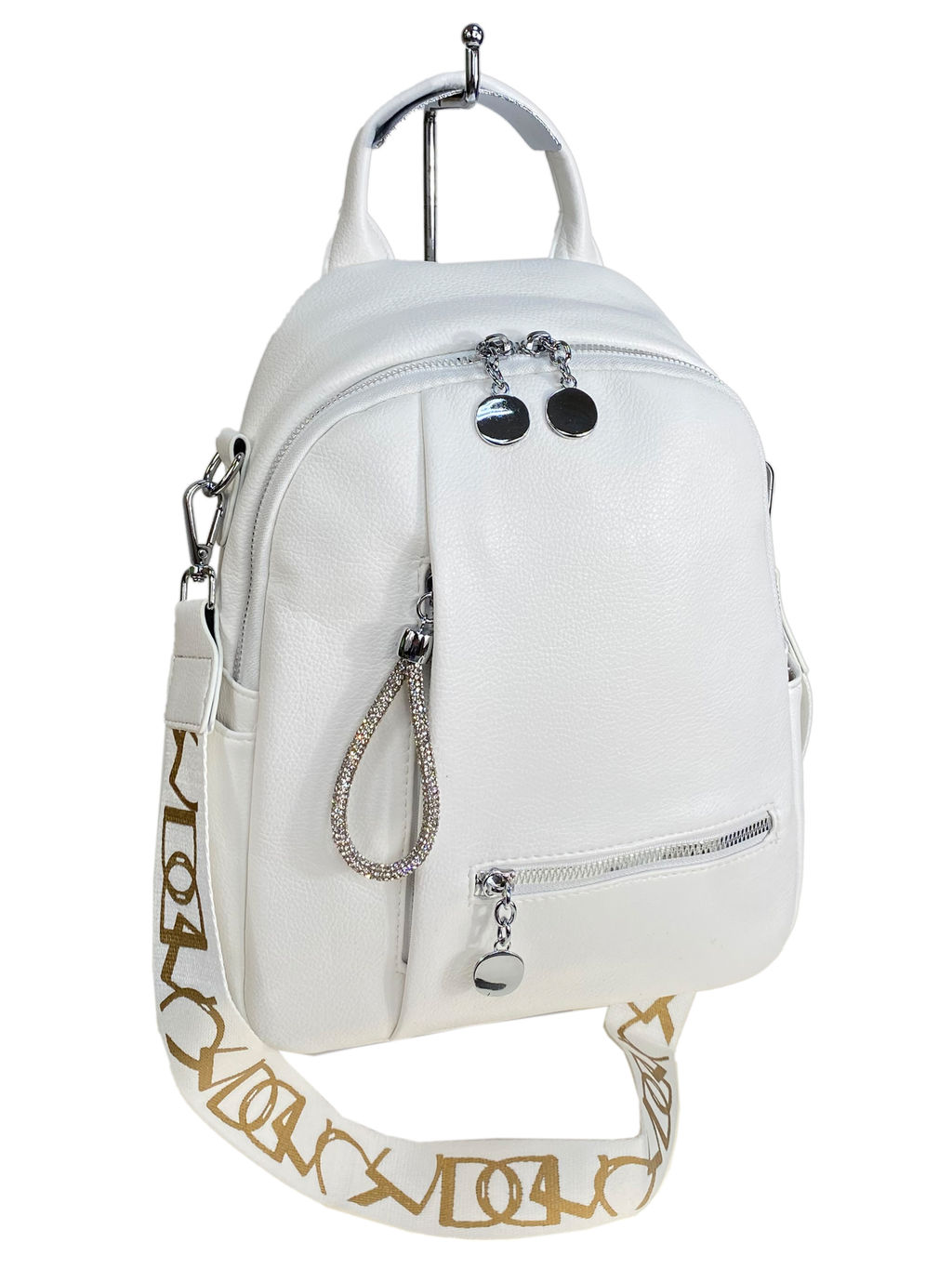 Современный, стильный женский рюкзак-трансформер для повседневной городской жизни. Выполнен из искусственной кожи. В комплект входит сьемный текстильный ремень с надписями. Закрывается на молнию. Внутри одно отделение с карманом на молнии и открытым карманом. Снаружи, на задней стенке, карман на молнии. На фронтальной поверхности два прорезных кармана на молнии. По бокам два открытых кармана.­
