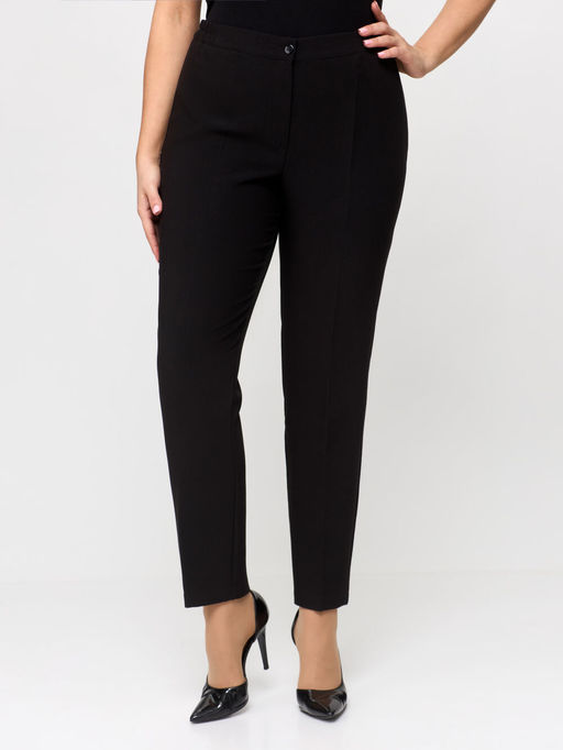 Брюки зауженные классические. Застежка на молнию, петлю и пуговицу. В поясе брюк по бокам вставлена резинка для удобства посадки на талии. Фурнитура от наличия может меняться.