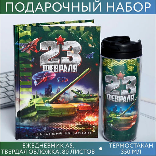 • Подарочный набор «23 февраля танк», ежедневник в твердой обложке А5, 80 л, термостакан 350 мл