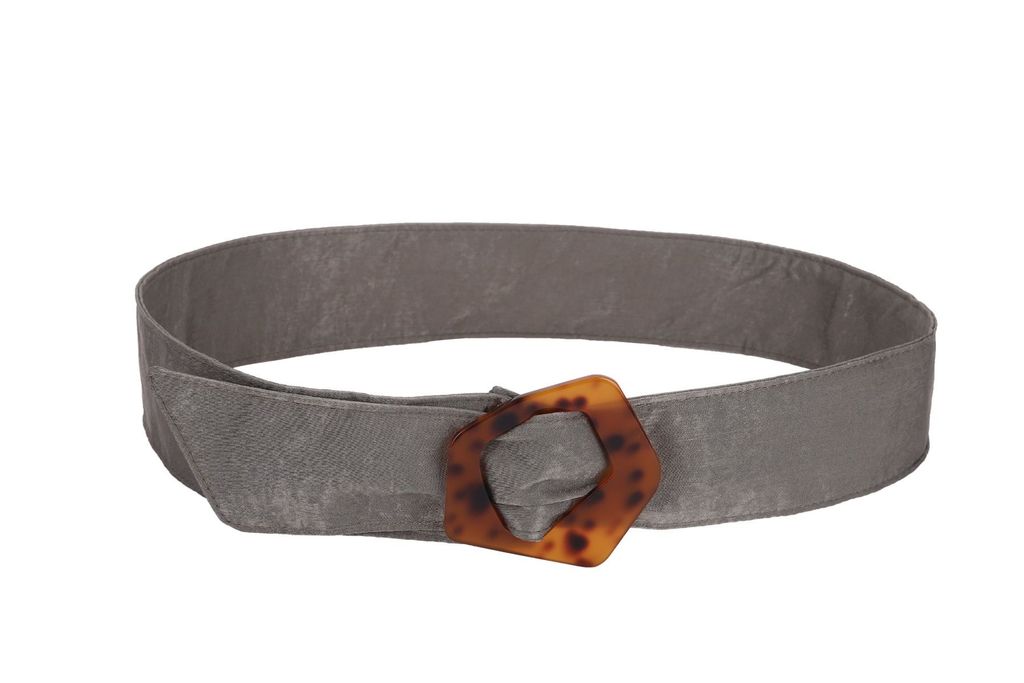 Мягкий текстильный пояс серого цвета идеально подходит для использования со свободными и длинными платья, а также чтобы разделить верх от низа и подчеркнуть талию. Такой аксессуар придает образу женственность и уникальность. Фигурная пряжка ремня выполнена из пластика в "черепаховом" цвете.