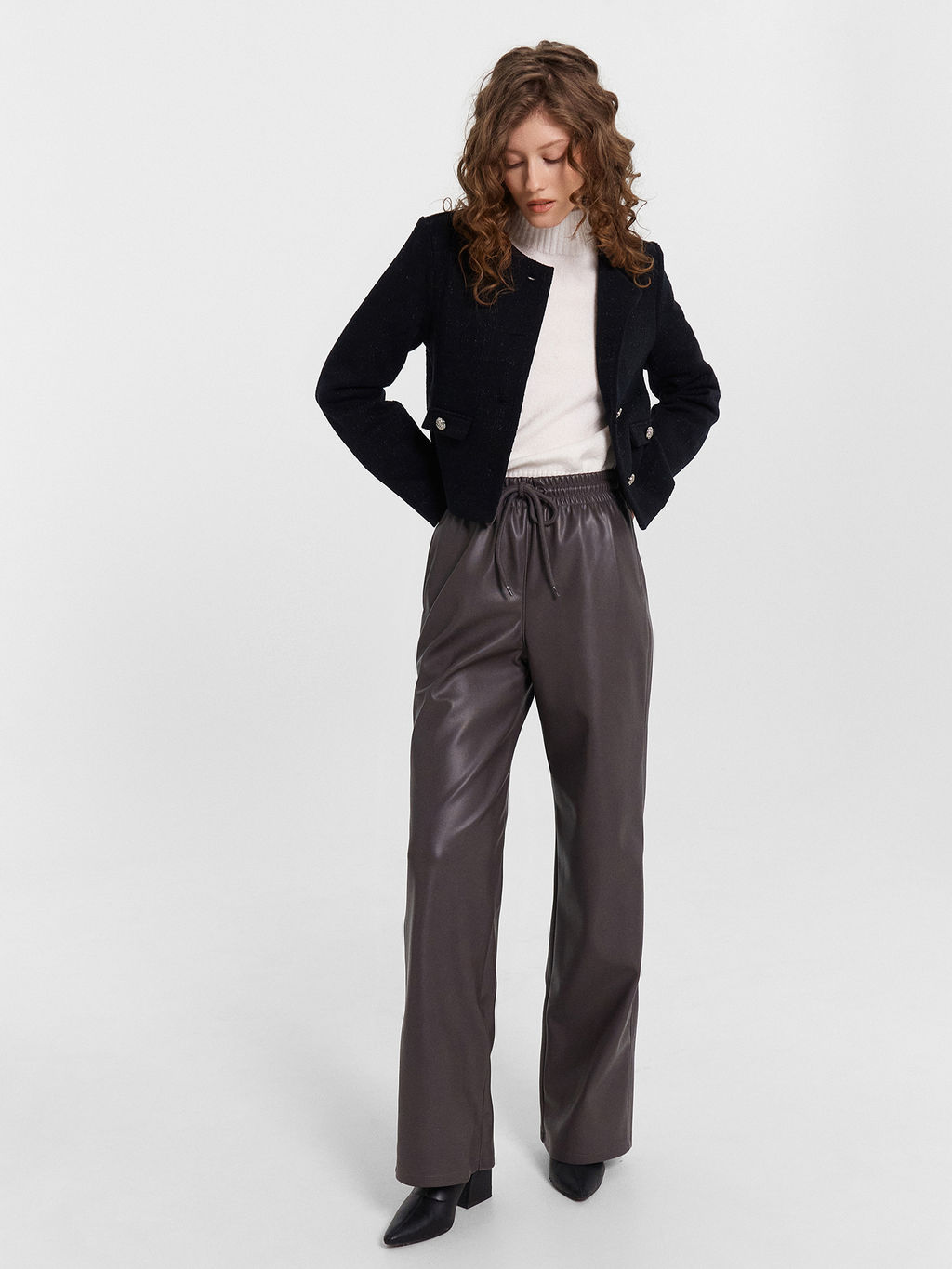 Кожаные брюки - один из наиболее практичных элементов женского гардероба! Поэтому наша коллекция не обошлась без стильных брюк из искусственной кожи, отличающиеся высоким качеством, а также стойкостью к растрескиванию и износу. Прямой крой, высокая посадка, удобные боковые карманы и эластичный пояс со шнурком обеспечивают идеальную посадку и комфорт в носке. В этих стильных брюках из искусственной кожи от Mark Formelle вы будете чувствовать себя уверенно и стильно в любой ситуации!­