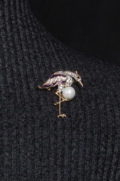 Брошь - цапля выполнена из металла золотого цвета, украшена сверкающими стразинками, жемчужиной и эмалью фиолетового цвета.