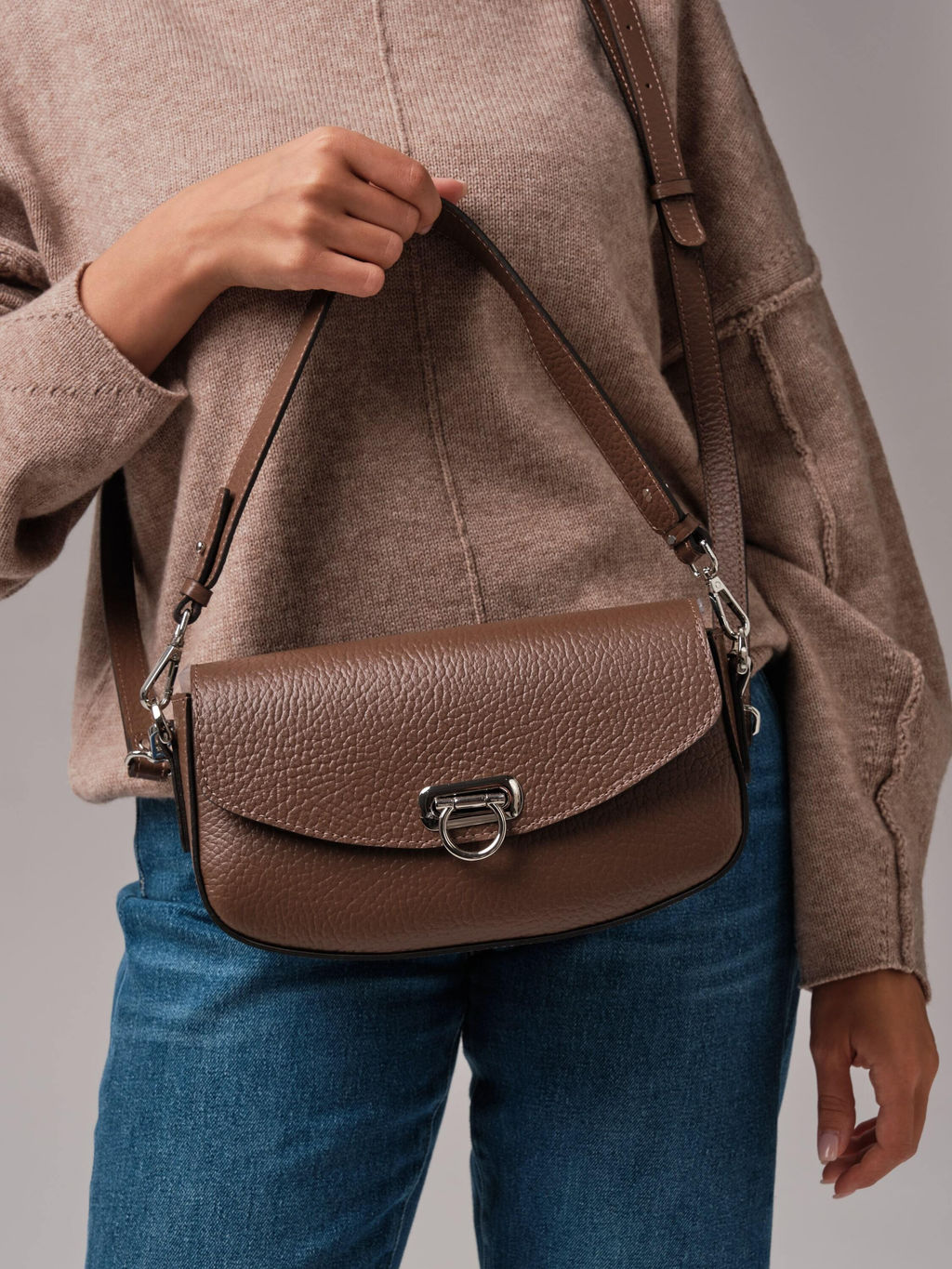 Элегантная женская сумка кросс-боди Azaro 31049 коричневый какао соло из натуральной кожи в цвете Коричневый какао соло станет незаменимым аксессуаром для современной девушки. Актуальная форма этой кожаной сумки багет идеально подходит для повседневного использования, будь то прогулка по городу или встреча с друзьями. Длинный регулируемый ремень позволяет носить ее как кросс-боди через плечо, освобождая руки. Также в комплект входит короткий съемный ремень для ношения на плече или локте. Благодаря средним размерам, модель компактна и вмещает все необходимые вещи: телефон, кошелек и косметику, не создавая лишнего объема и сохраняя элегантность вашего образа. Классический дизайн сумки Azaro делает ее универсальной - она легко сочетается с любыми образами. Каждая деталь этой модели проработана с вниманием к мелочам, что делает ее не только красивым, но и функциональным аксессуаром. -- Характеристики -- Цвет: коричневый какао Материал: Натуральная кожа;Замша натуральная Бренд: Azaro Тип: Сумка на плечо, Сумка через плечо Страна-изготовитель: Россия Высота, см: 17 Ширина, см: 27 Глубина, см: 7 Материал подкладки: Хлопок Количество внутренних отделений: 1 Количество внешних карманов, шт: 1 Тип застежки: Магниты Формат А4: не вмещает Высота ручек, см: 23 Длина плечевого ремня, см: 120 Вес товара, г: 440 Ручки: На плечо, На локоть, Плечевой ремень Пол: женская коллекция Группа товара: Сумки Выгружать товары на сайт: Да Количество внутренних карманов, шт: 2