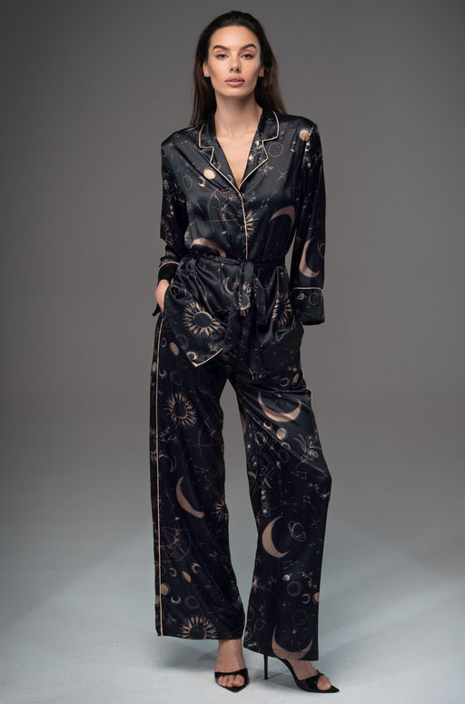 Комплект жакет с брюками Mia-Amore выполнен из принтованного смесового шёлка. Жакет с центральной застежкой на пуговицы и длинными рукавами, манжеты рукавов декорированы кантом. Кантом оформлен воротник и борт жакета. Жакет дополняет широкий съёмный пояс. Широкие принтованные брюки с контрастными кантами в боковых швах, с поясом на резинке и боковыми кармашками. Состав: 70% натуральный шёлк, 25% полиэстер, 5% эластан