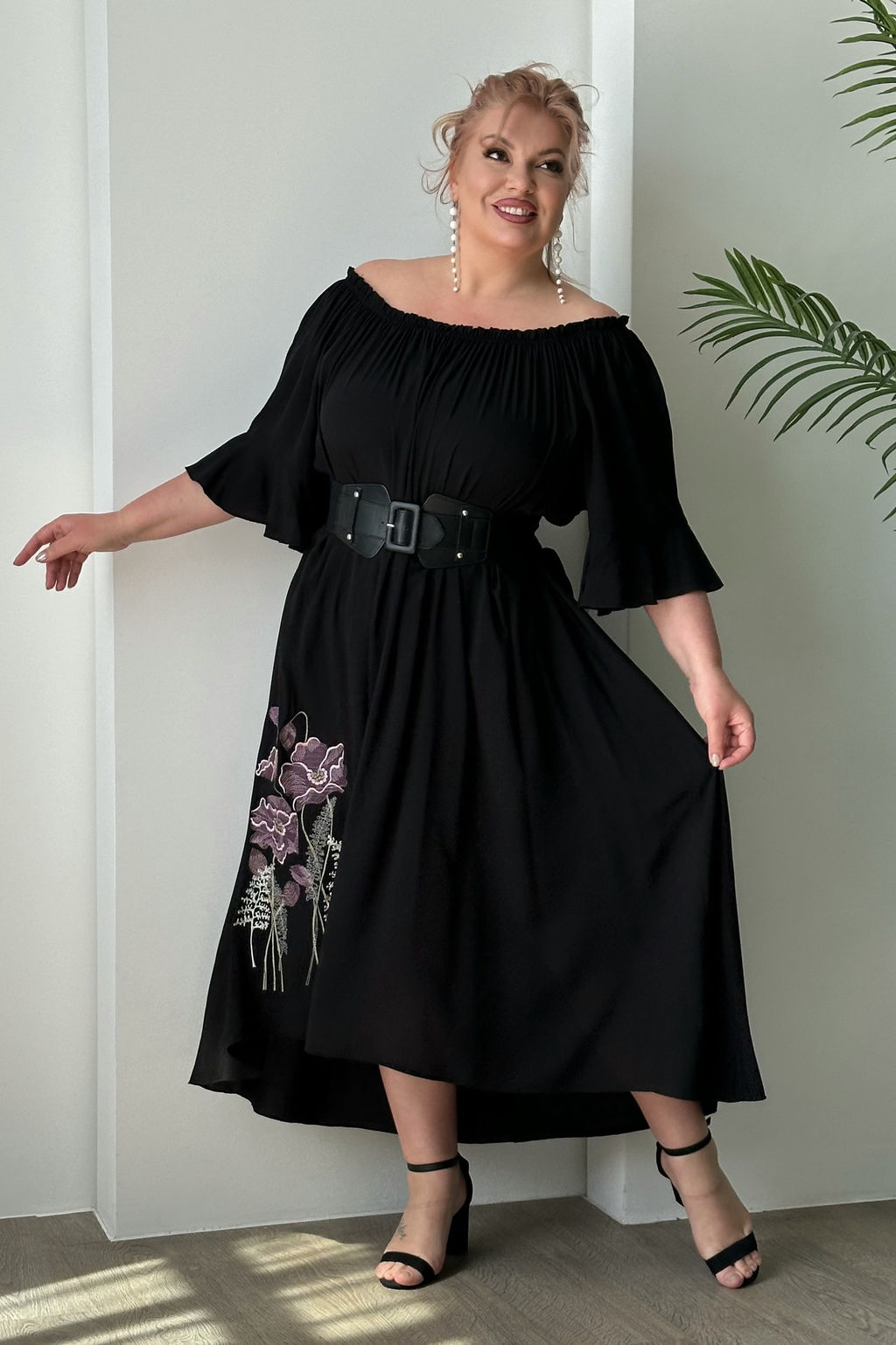 Платье открытое плечо с цветами черное