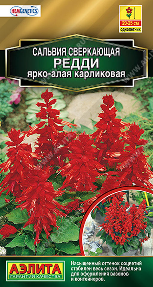 Будто пламя в ночи, огненный цветочный маяк это сорт карликовой сальвии Редди голландской селекции от компании Hem Genetics! Отличается ранним и равномерным цветением. Соцветия крупные и плотные. Ярко-алые цветки обильно покрывают центральный побег, а изумрудные листья сосредоточены в его нижней трети. Растения карликовые высотой 20-25 см. Сорт Редди подойдет для составления смешанных цветочных вазонов в саду и контейнеров на балконе. Плотные, групповые посадки сальвии оживят и украсят цветники различных типов.