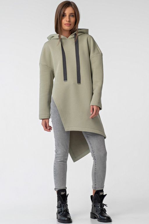 Особенности: Туника прямого силуэта из футера с начесом. Детали: спущенная линия плеча, капюшон с декоративными лентами, асимметричная линия низа с высоким фигурным разрезом.