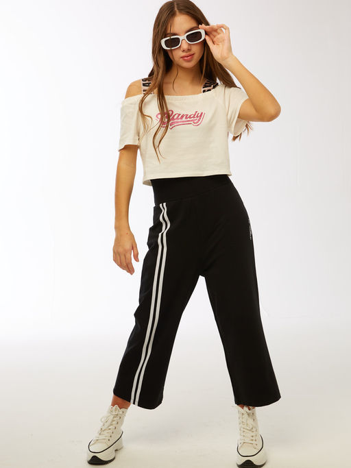Брюки трикотажные для девочки, широкие, с карманами в боковых швах, с высокой талией. Пояс широкий, с эластичной тесьмой внутри, на правой передней половинке есть настрочные лампасы. Состав:92% хлопок, 8% лайкра