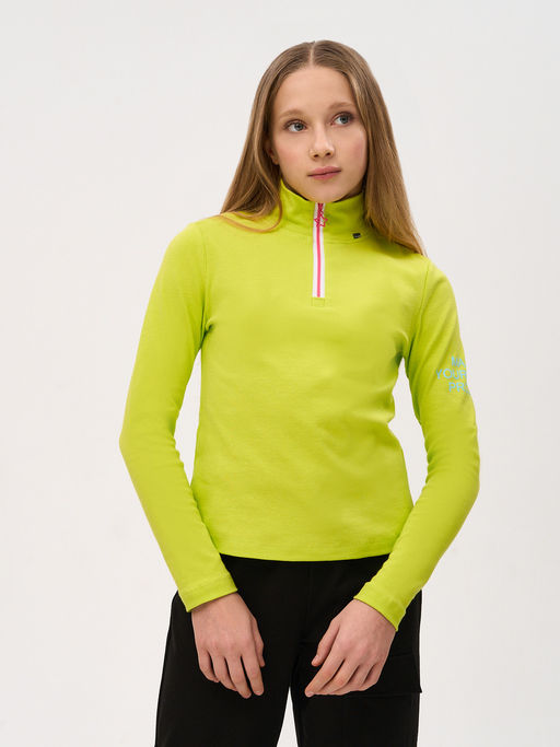 Водолазка из рибаны с лайкрой, прилегающего кроя, высокий воротник , длинные рукава, застежка на короткую молнию. Принт на рукаве. Состав:92% хлопок, 8% лайкра