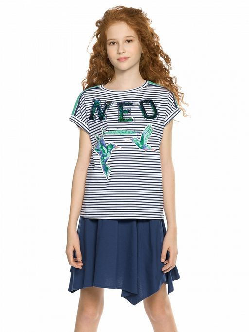 Комплект для девочек футболка и юбка. Футболка свободного объёма с цельнокроеным рукавом с отгибающейся закрепленной манжетой. Вдоль линии плеч настрочена декоративная трикотажная тесьма. По переду изделия принт с разноцветным глиттером в виде птичек колибри и надписи, перевод Блестящее будущее , и вышивка из переливающихся переворачивающихся пайеток. Юбка Новинка. Прямоугольная юбка с фигурной угловатой линией низа, пояс на широкой внутренней резинке.