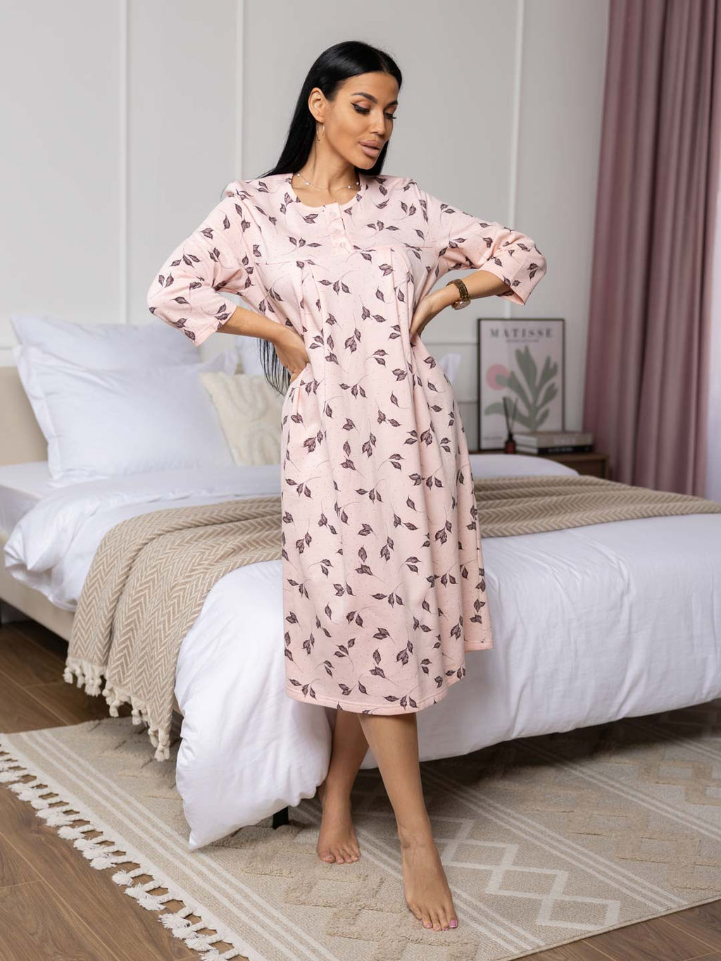Женская ночная сорочка длиной ниже колена с рукавом 3/4 и округлой горловиной на пуговицах. Материал имеет притную к телу изнанку, благодаря которой вы не замерзните даже в самые морозные дни.­